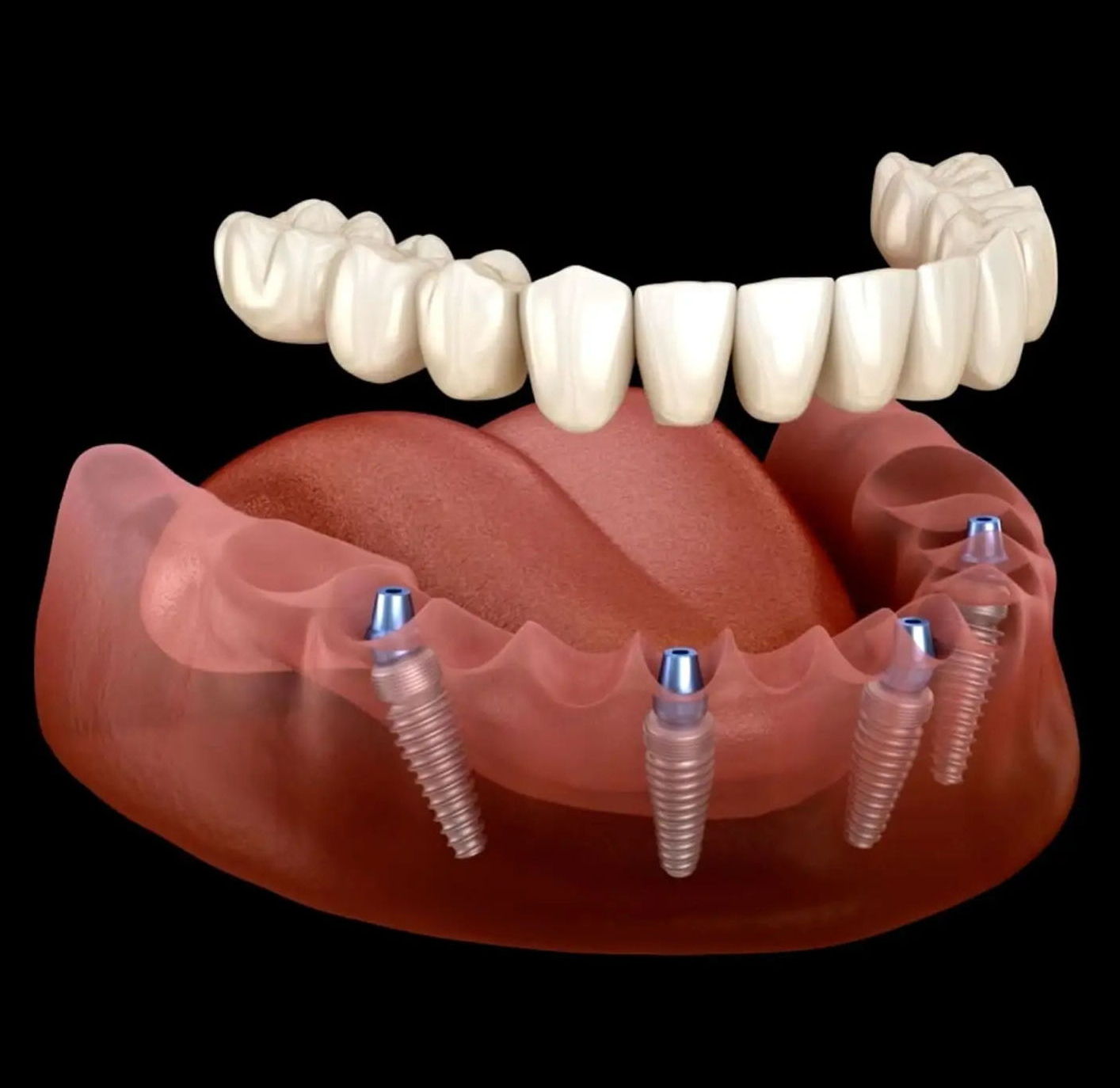 Į žandikaulį įsriegami 4 implantai specialiu kampu, užtikrinant stabilumą.